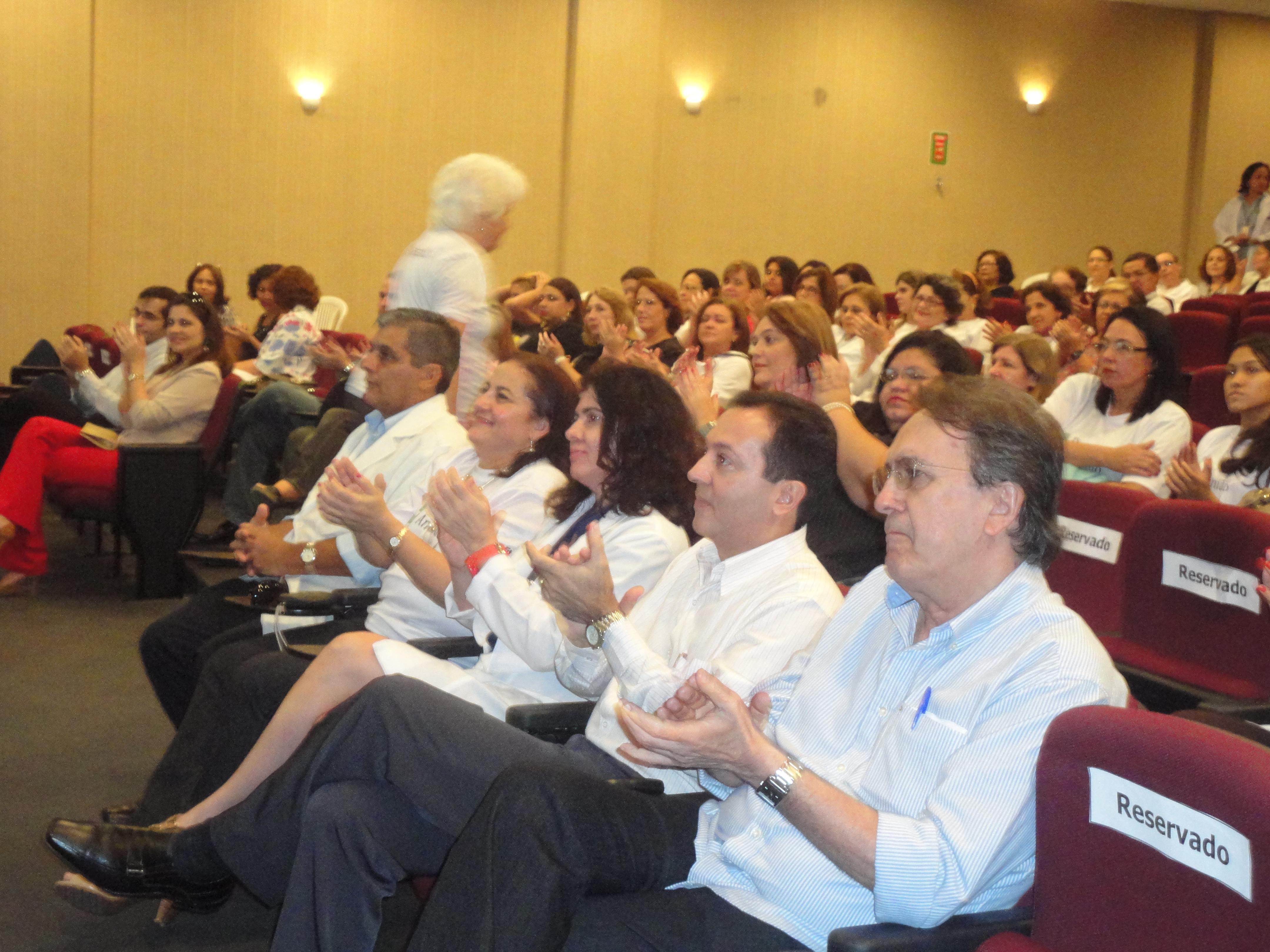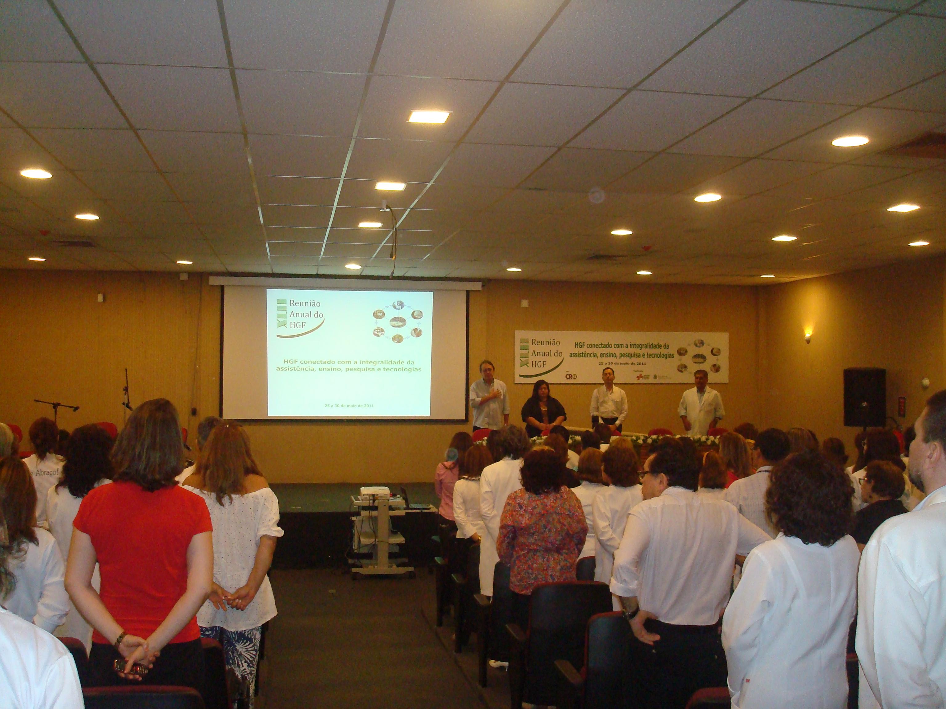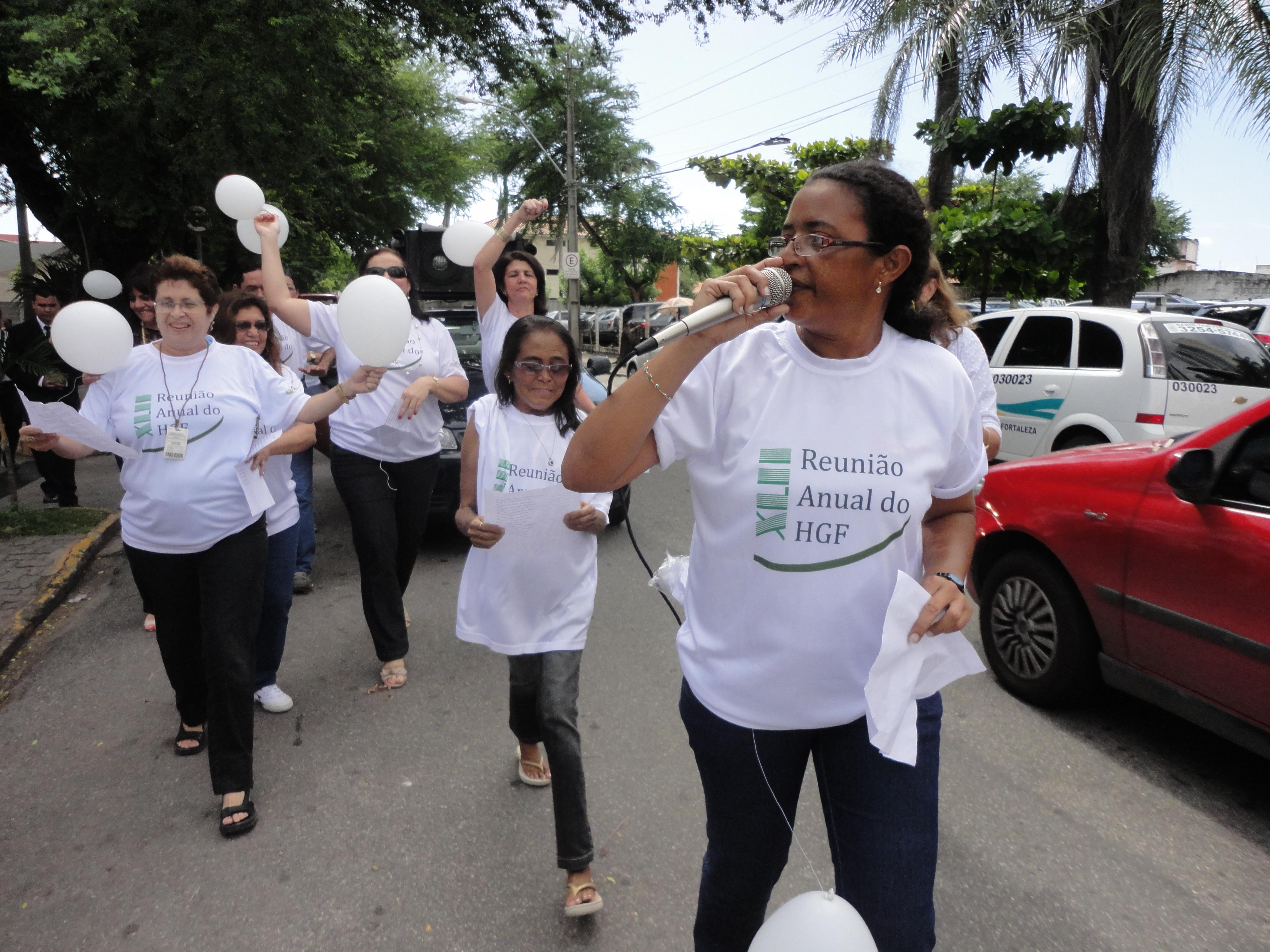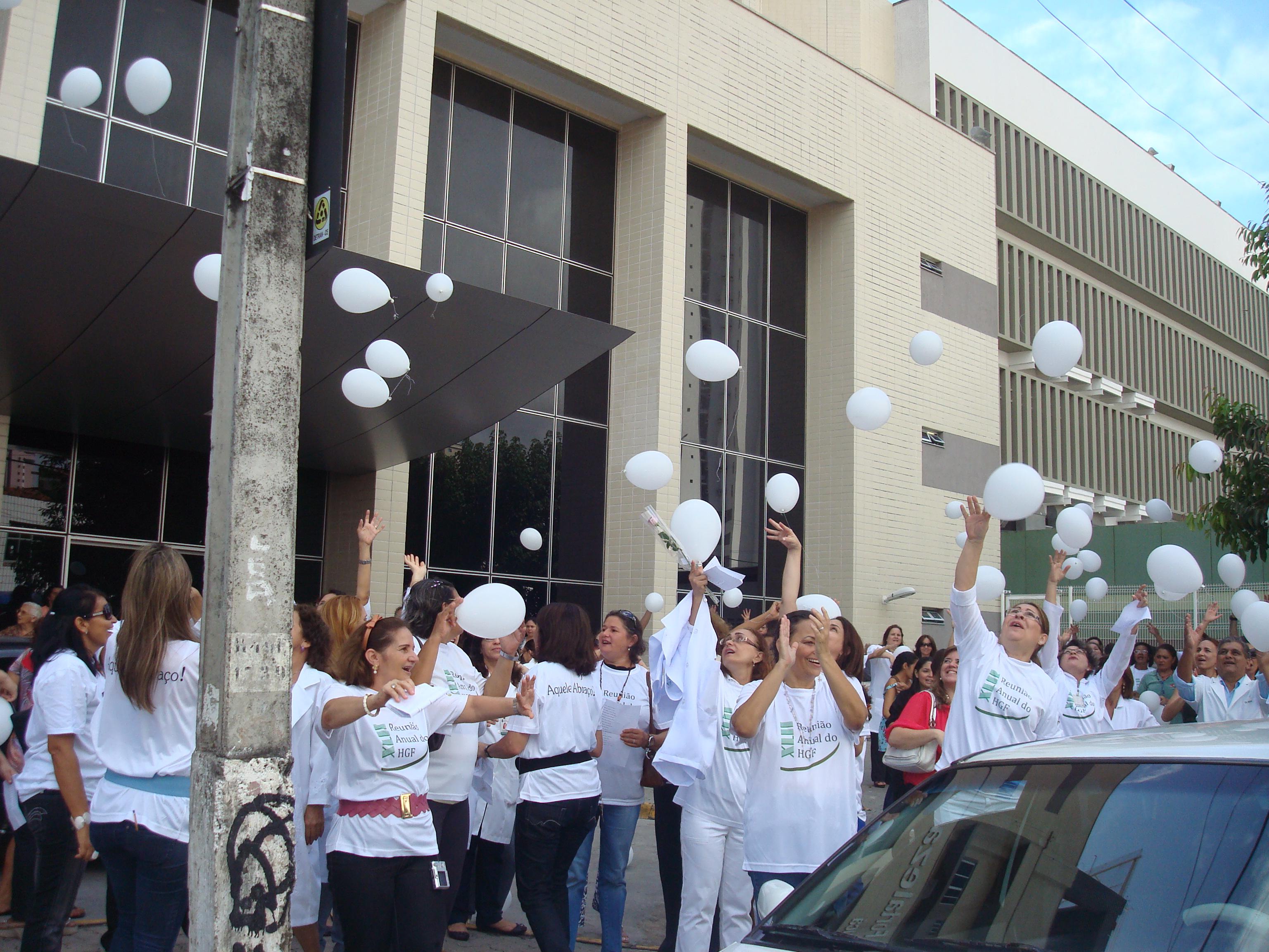 Após o grande abraço ao HGF, que terminou em frente à Unidade Régis Jucá com revoada de balões brancos, os funcionários cantaram parabéns para o HGF. Em seguida, todos seguiram para o auditório principal, onde foi realizada a abertura oficial da 42ª Reunião Anual do HGF.