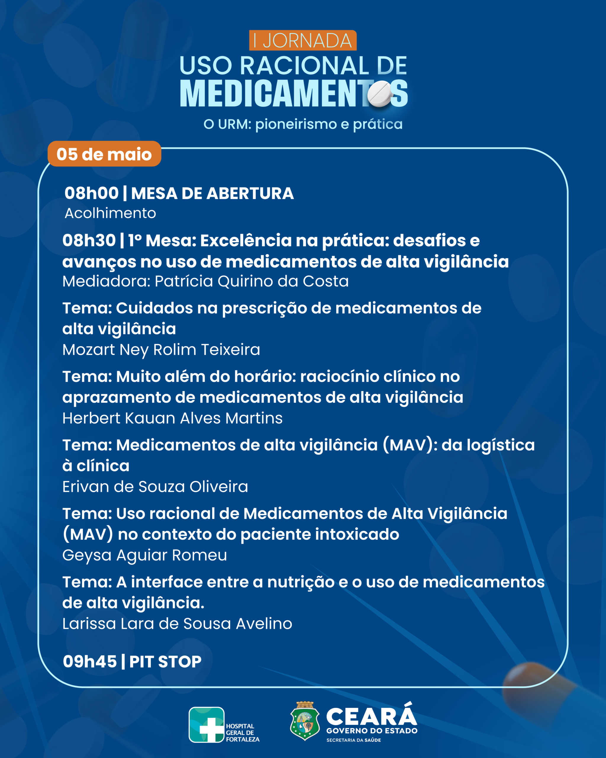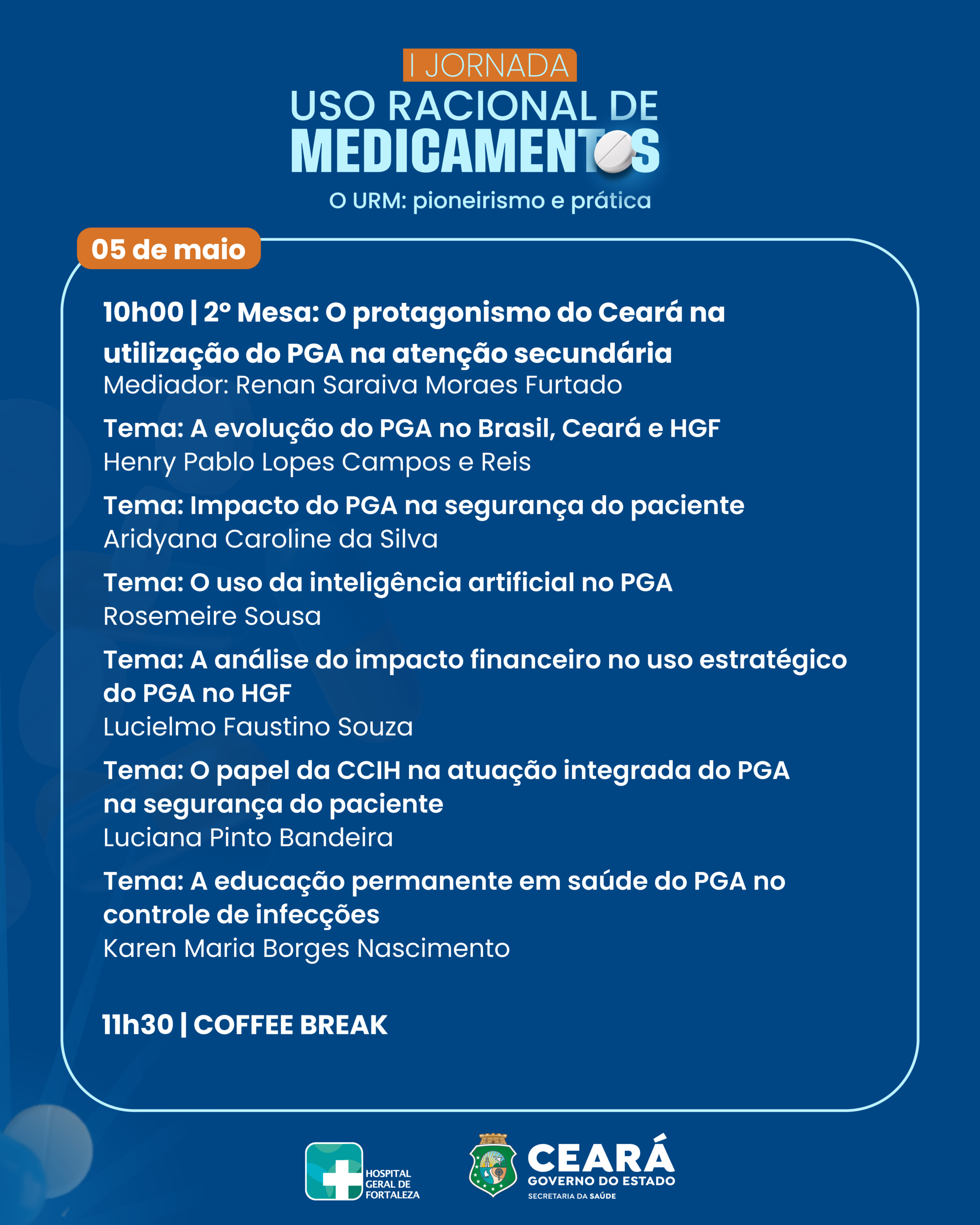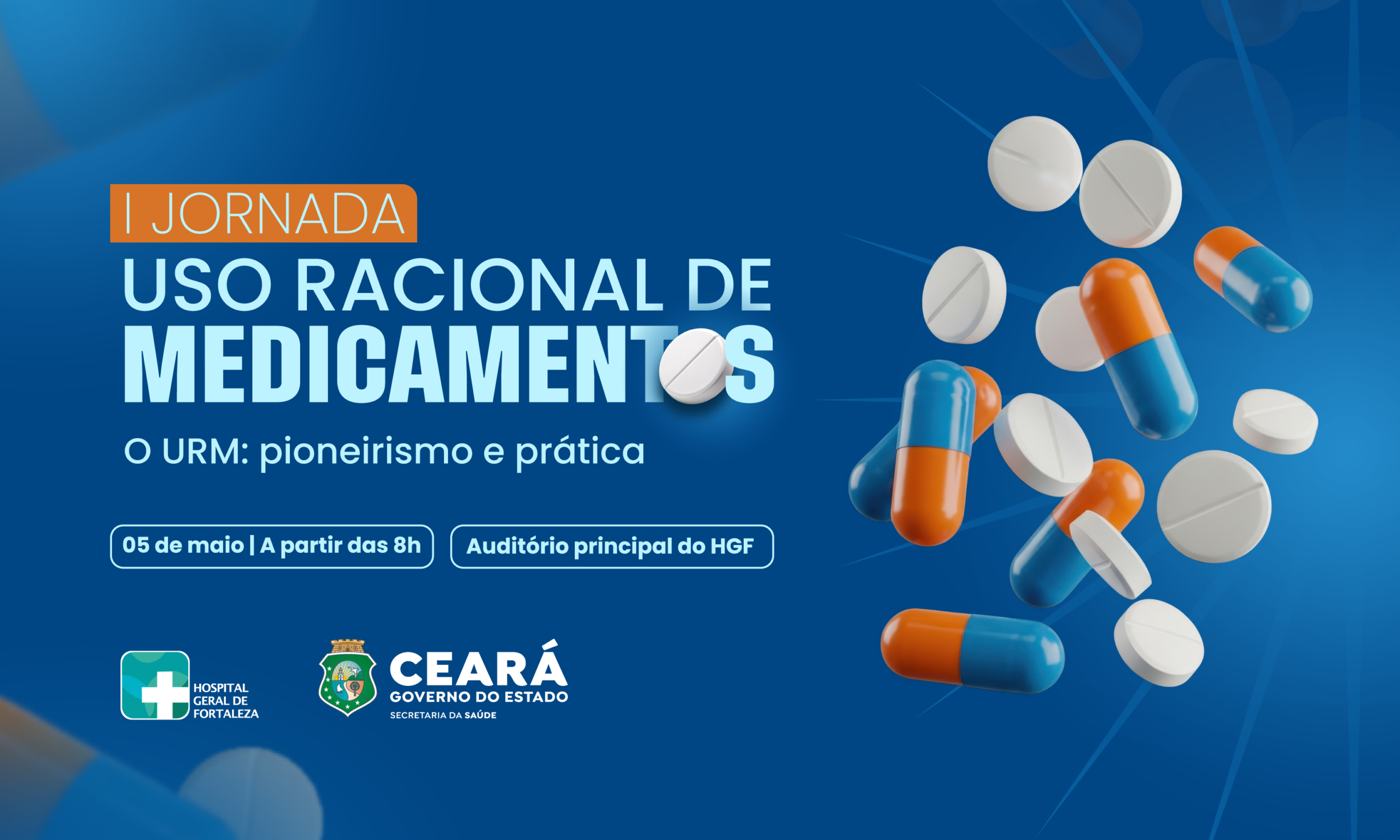 O Hospital Geral de Fortaleza (HGF), equipamento da Secretaria da Saúde do Ceará (Sesa) realiza, no dia 5 de maio de 2026, a Jornada Uso Racional de Medicamentos com o tema “URM: pioneirismo e prática”. O evento ocorre no Auditório Principal da unidade e marca o Dia do Uso Racional de Medicamentos, que acontece na mesma data.